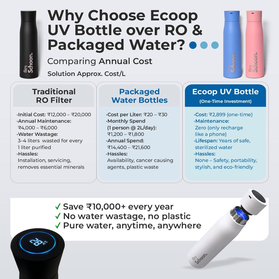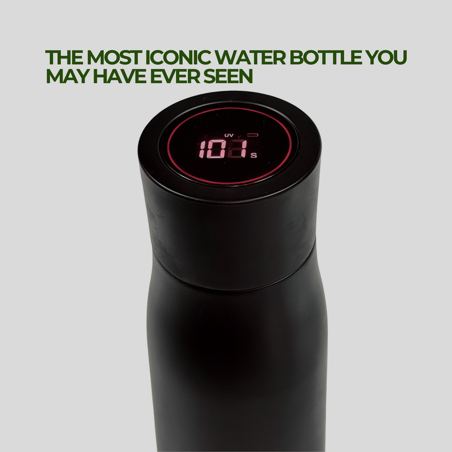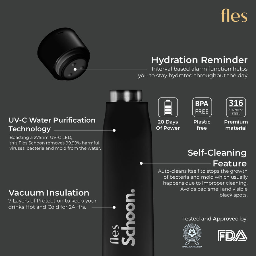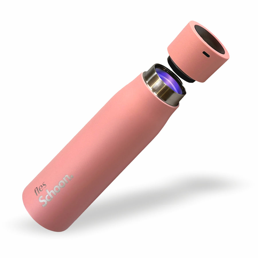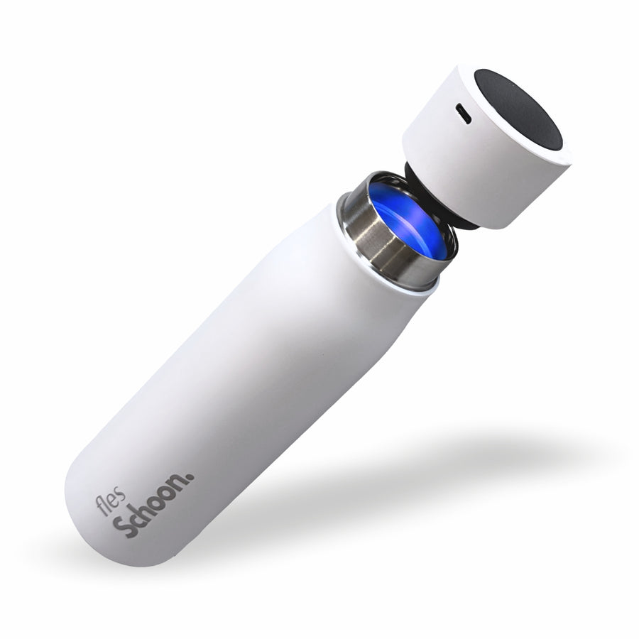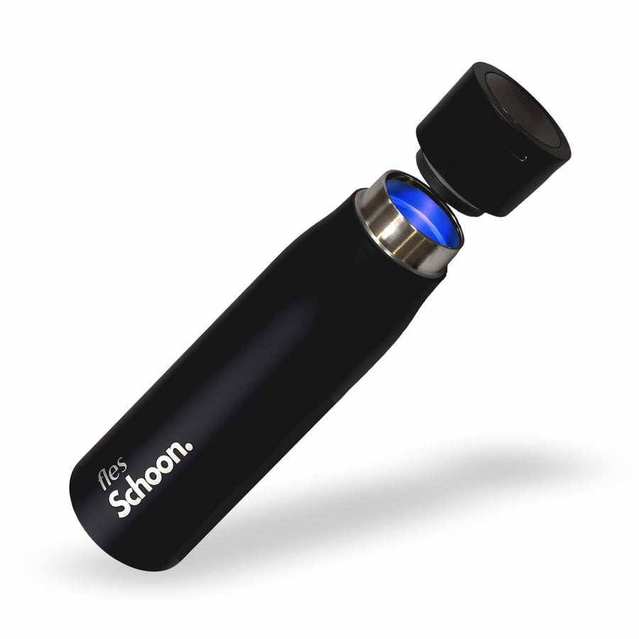 Fles Schoon is a UV-C sterilization smart water bottle designed to eliminate 99.99% of bacteria and viruses using medical-grade UV light.